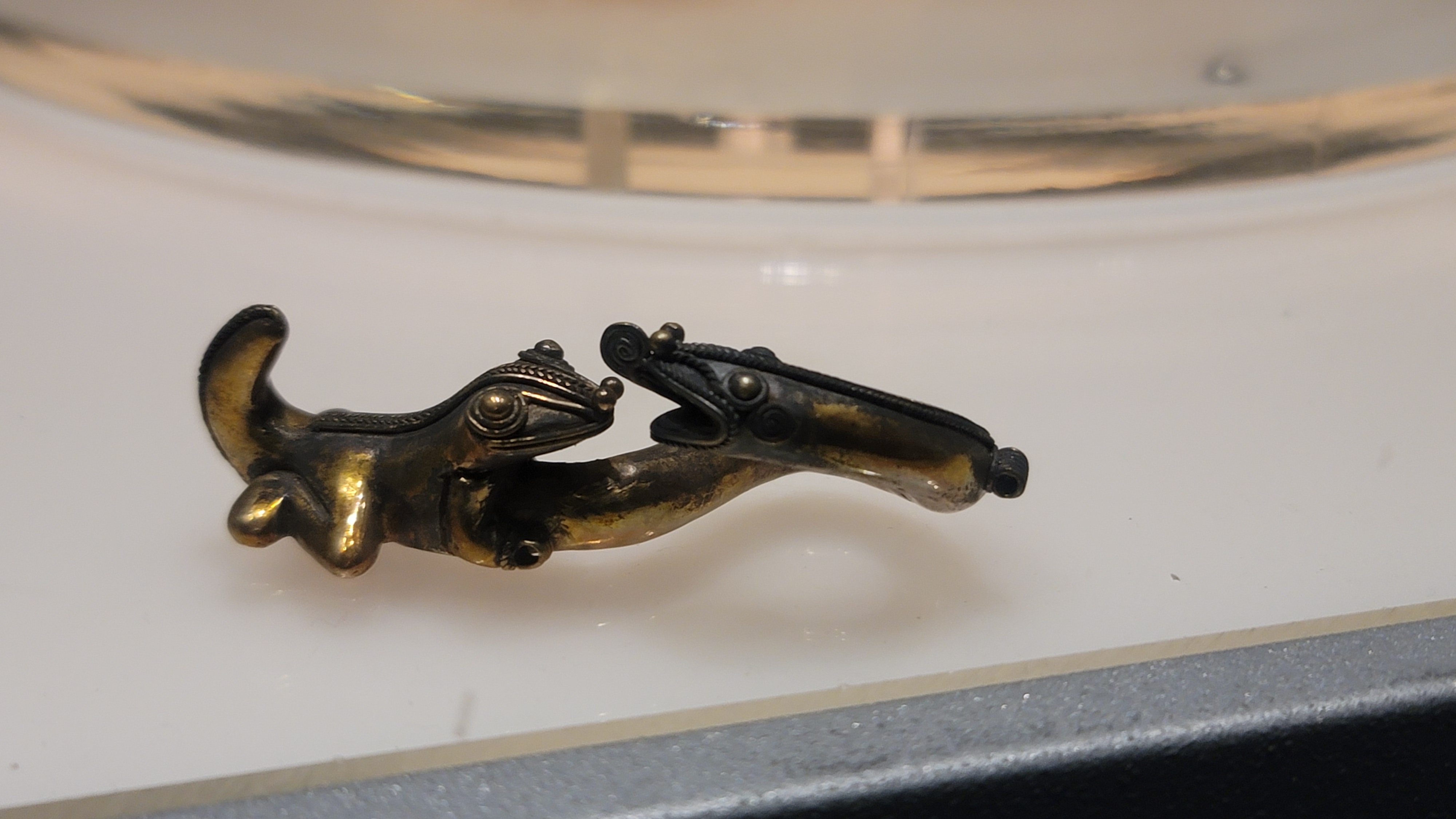 어딘가 넓적한 곳에 실로 꿰매붙이거나 하는 장신구가 아니었을지 생각해봅니다.