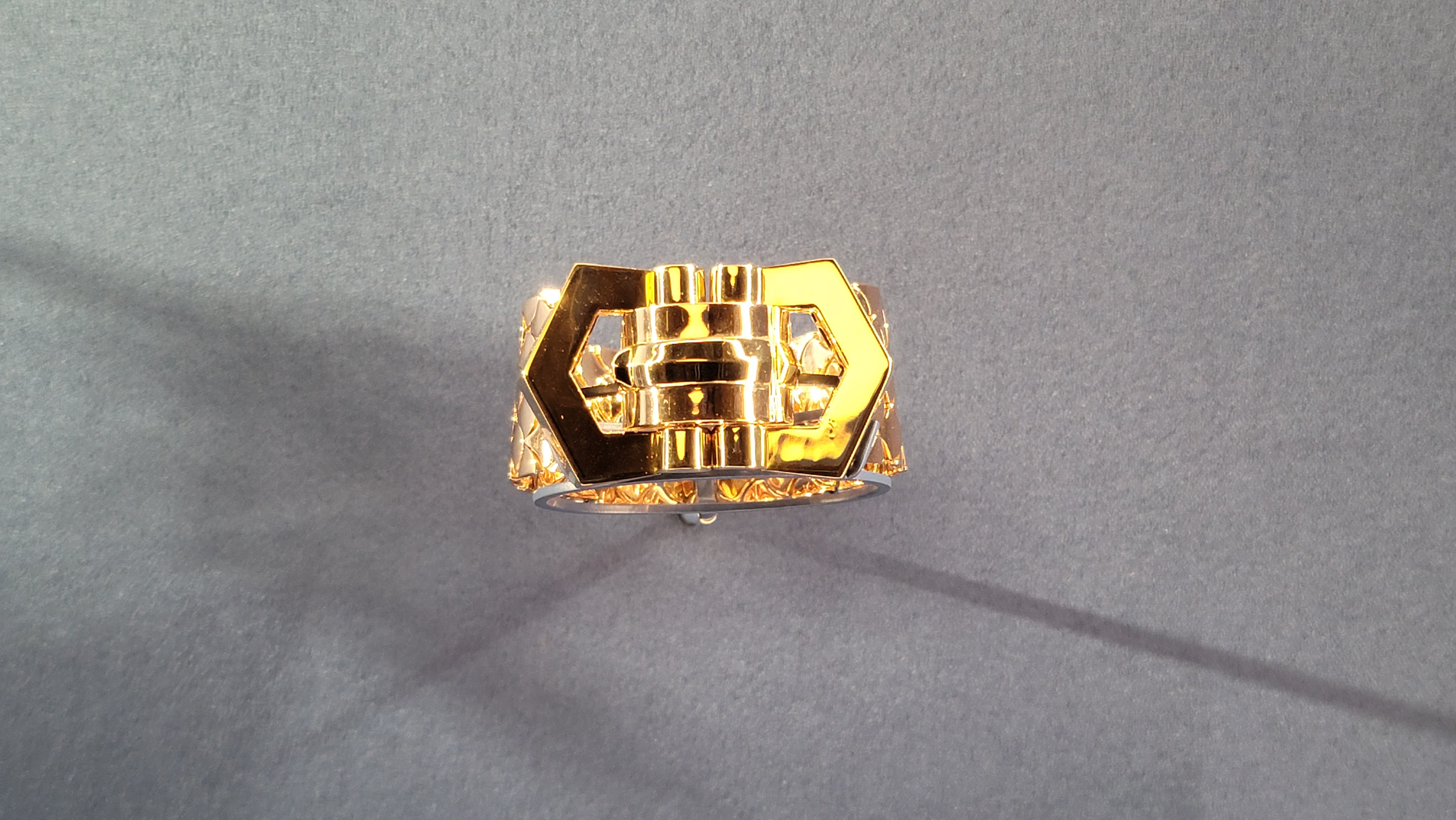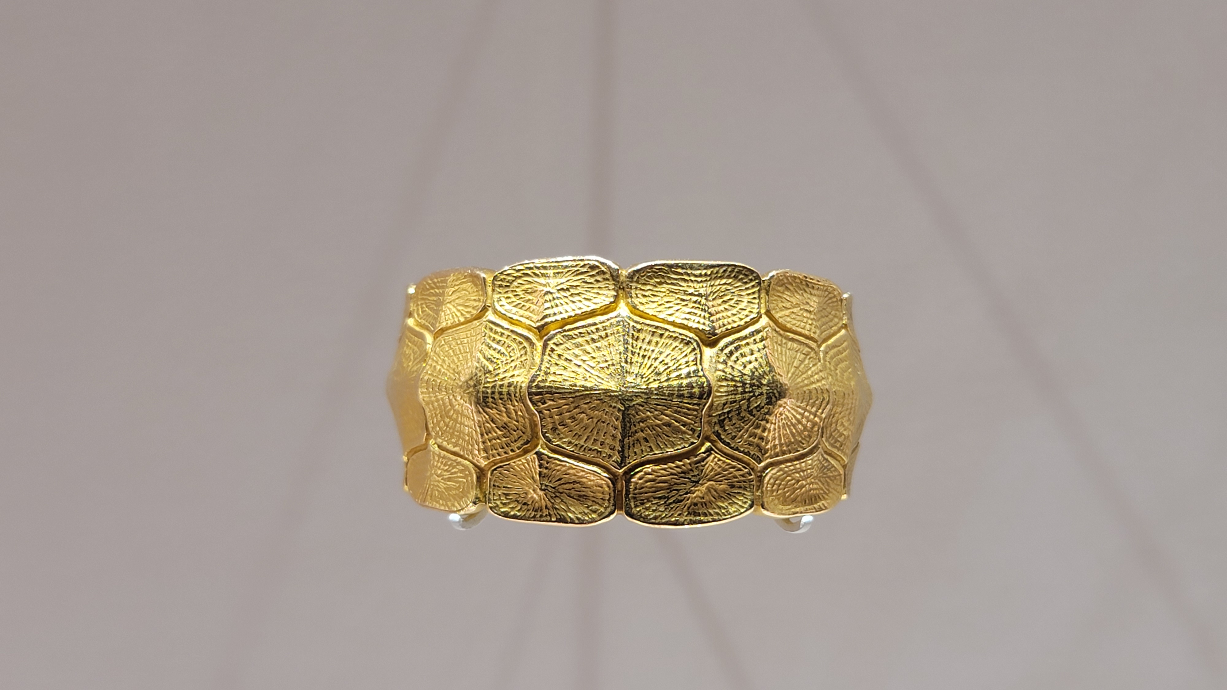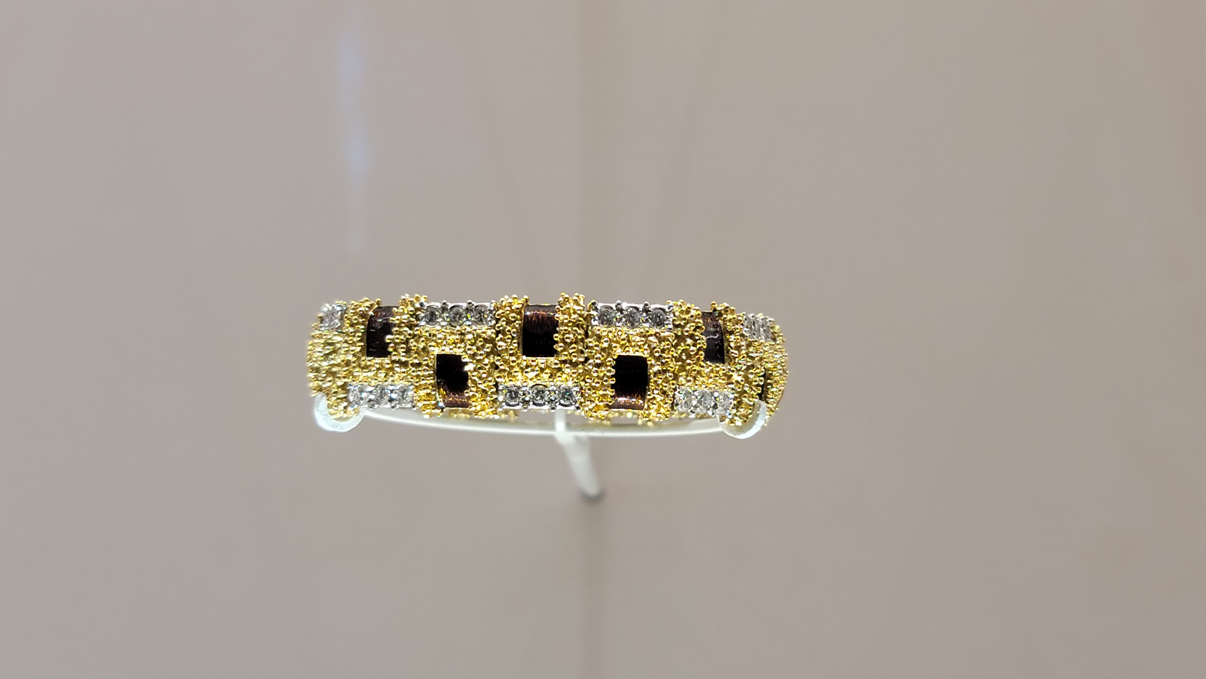 금을 네모지게 잘라서 금 깍두기들을 반지 표면에 붙임으로써 아주 독특한 표면을 만들었습니다.