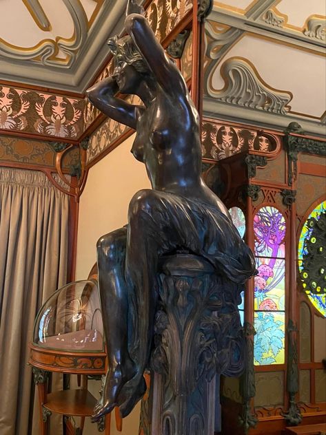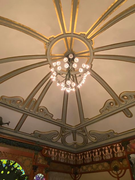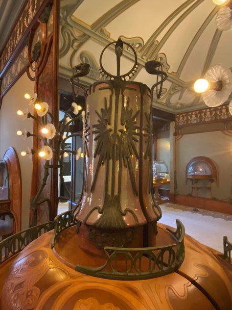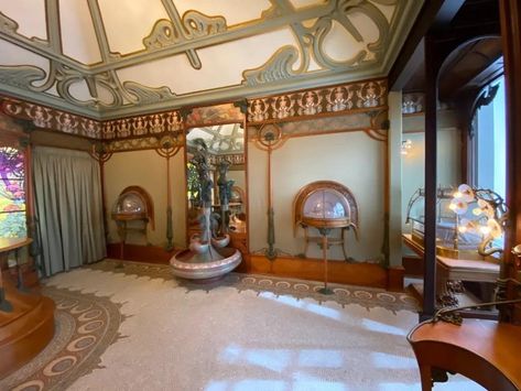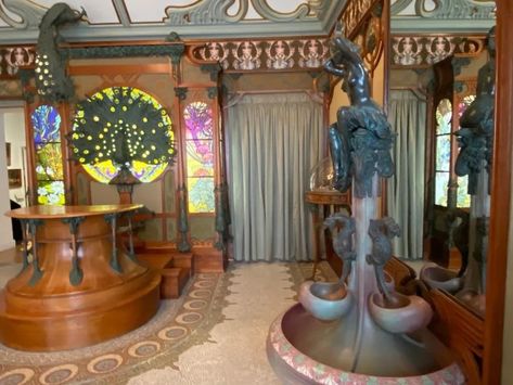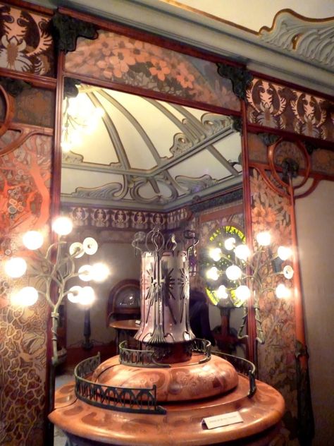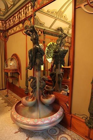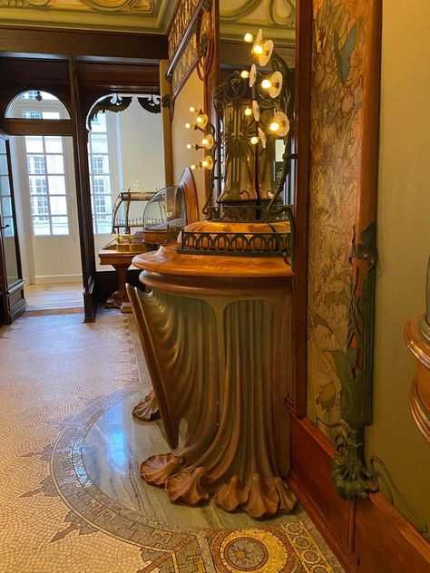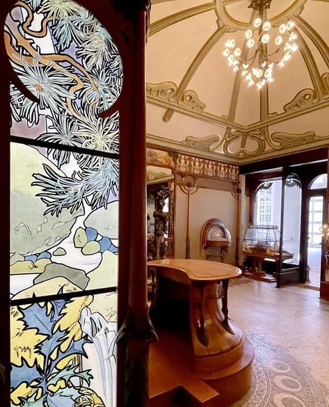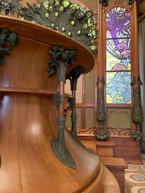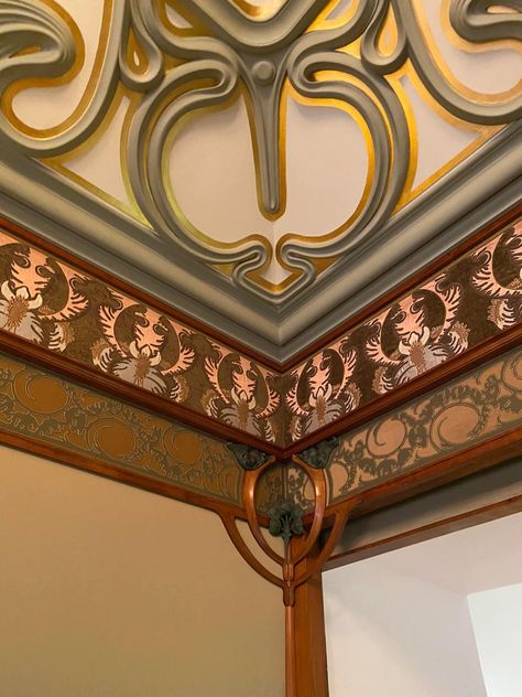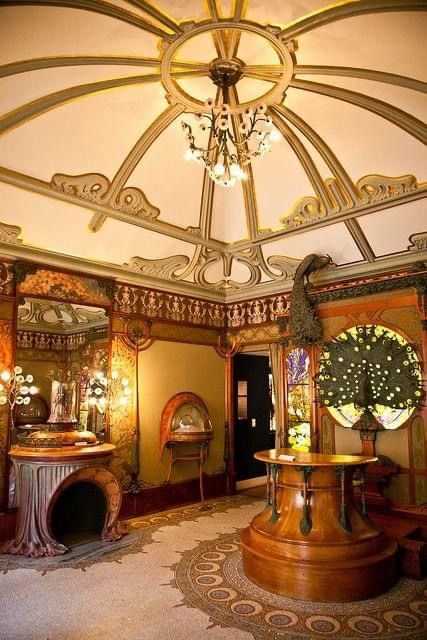 천장조차도 어느 한 군데 범상하지 않고, 유려하지 않은 곳이 없습니다. 샹들리에 위로 펼쳐지는 무하 특유의 곡선이 정말 환상적이네요. 벽지 패턴 역시 기묘하면서도 아름답습니다. 특히 저 우아한 몰딩의 나무 같은 형태가 너무 좋네요.