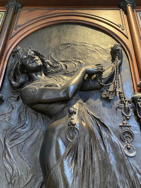 무하 디자인다운 장신구를 들고 있는 여성의...조각?