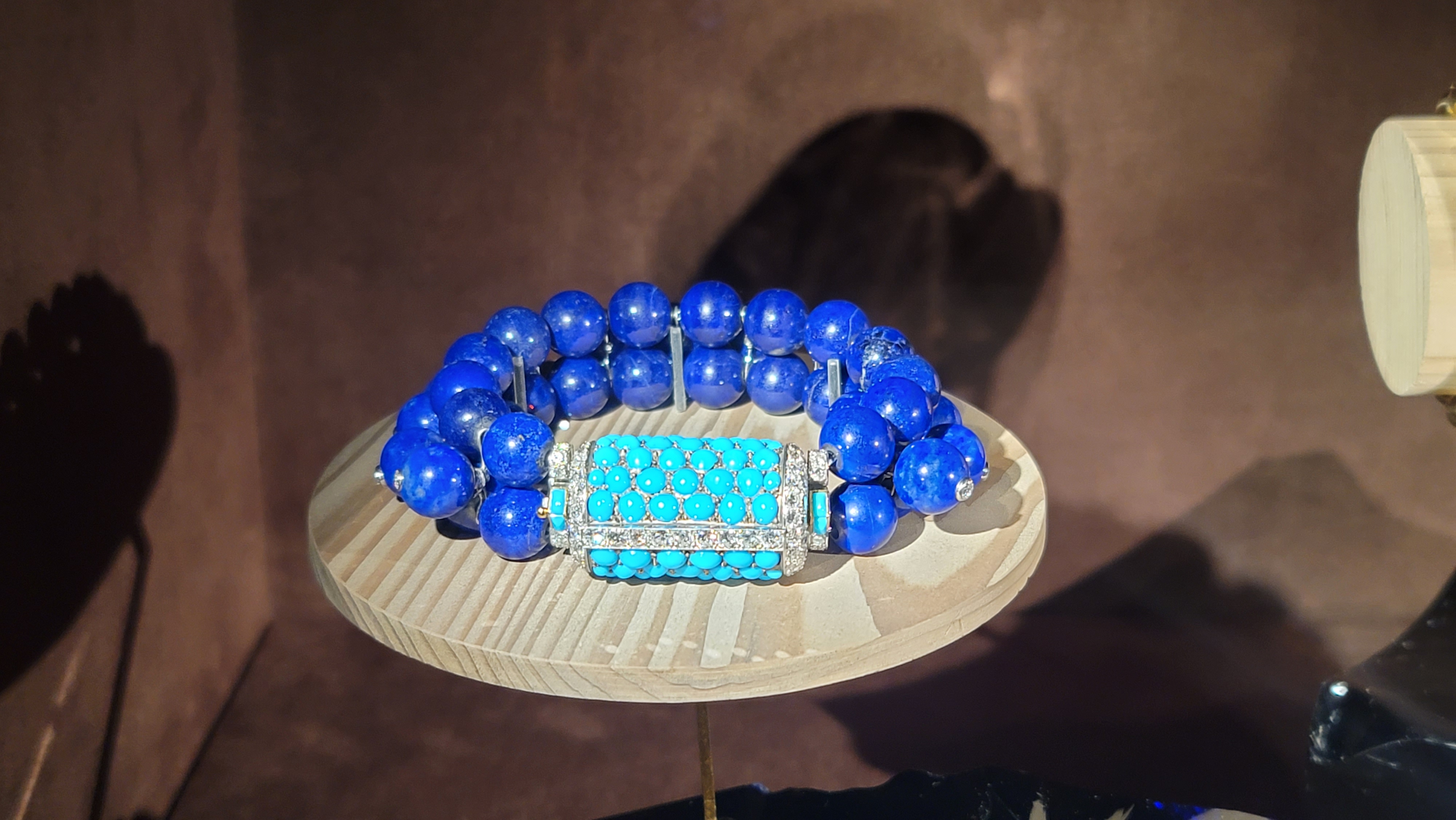 굵은 청금석 구슬에 푸르른 터키석 카보숑이 가득 박힌 팔찌.
