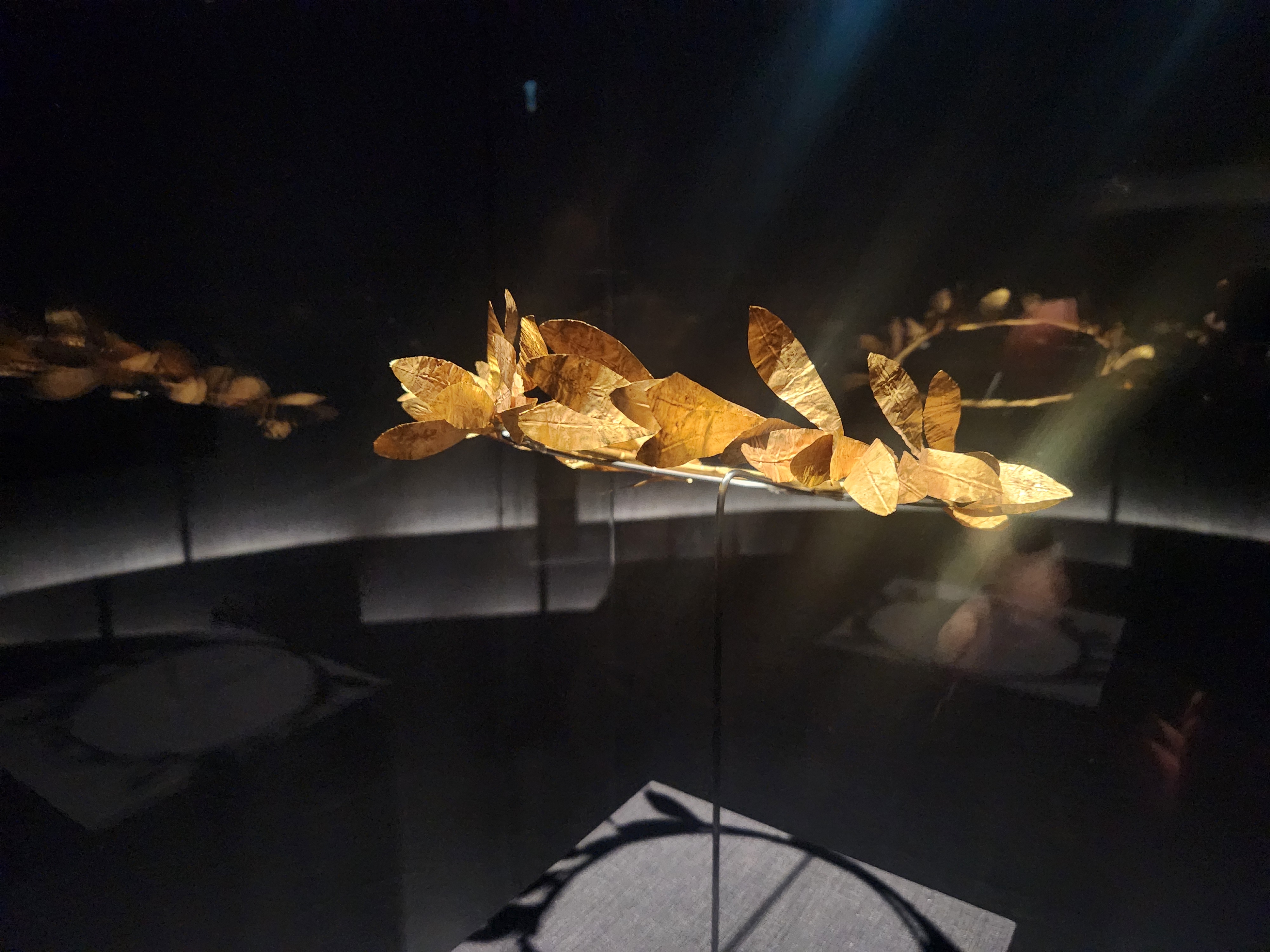 금 막대를 뽑아서 구부리고 거기에 세공한 얇은 금잎을 붙인 관입니다.