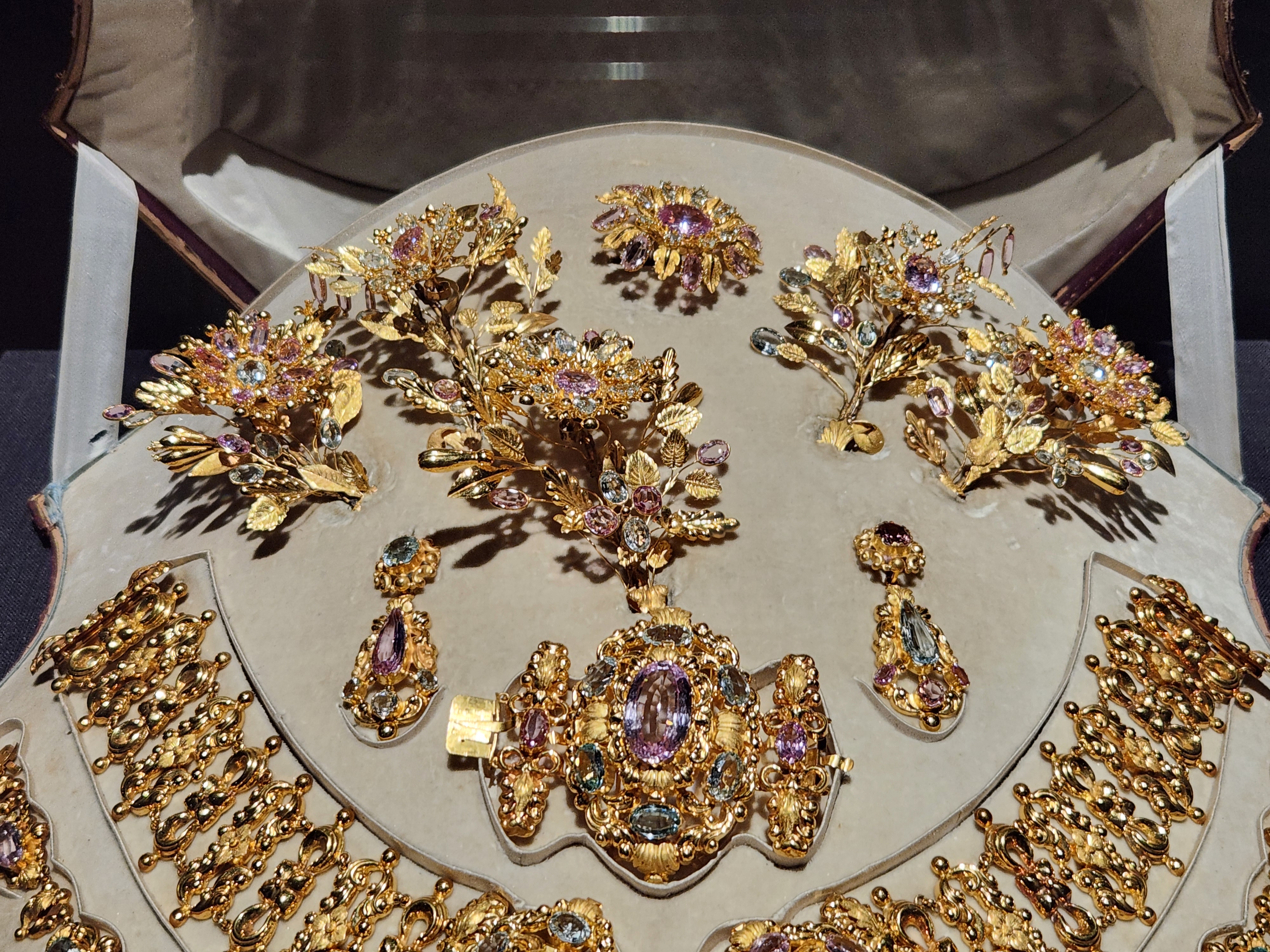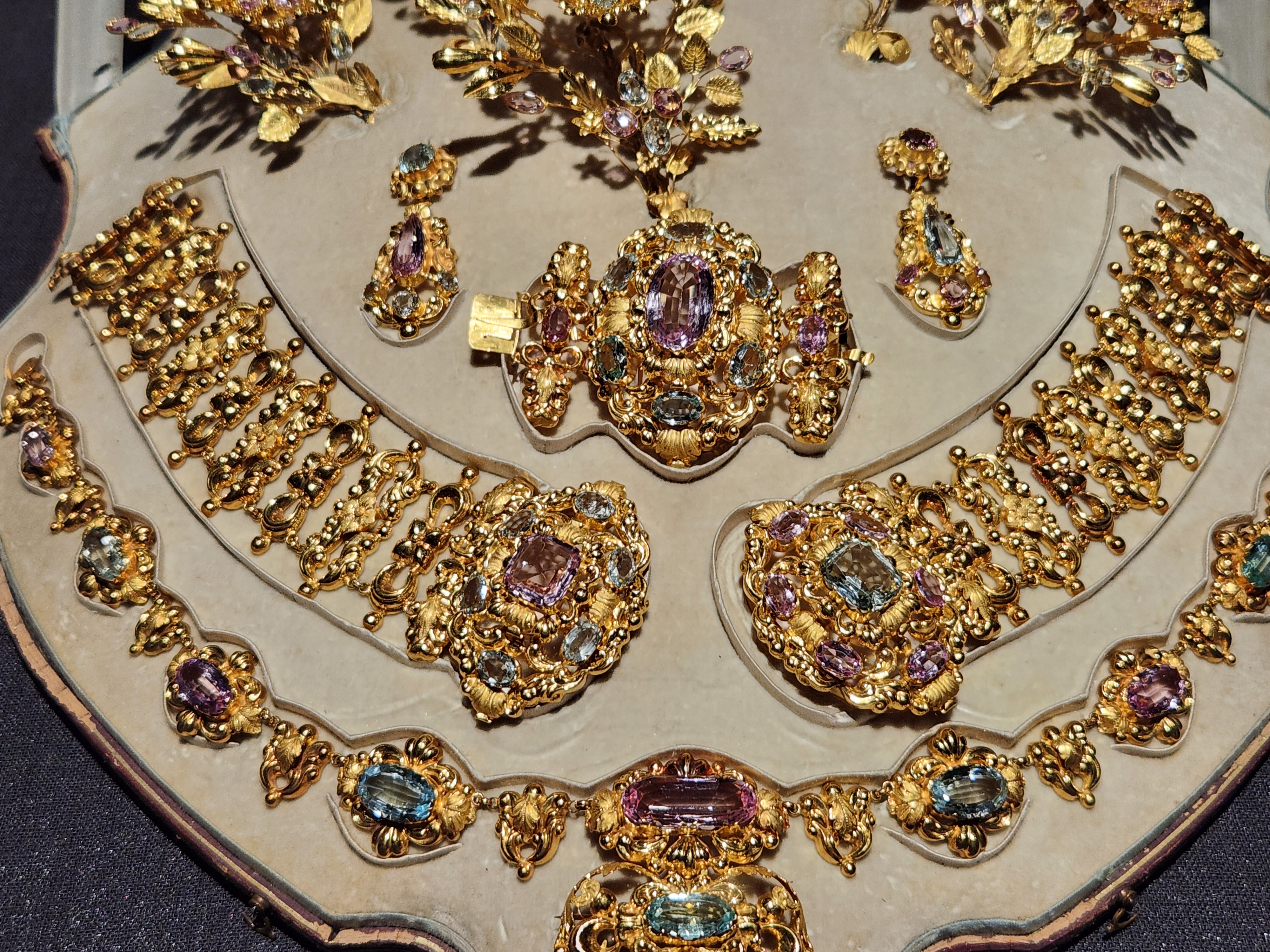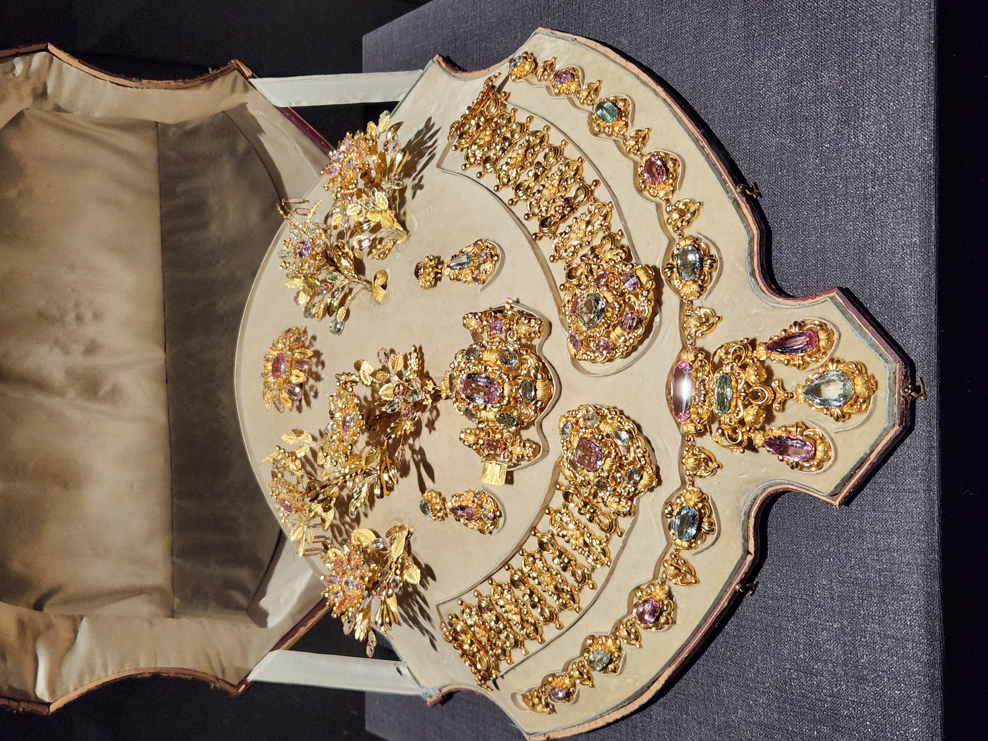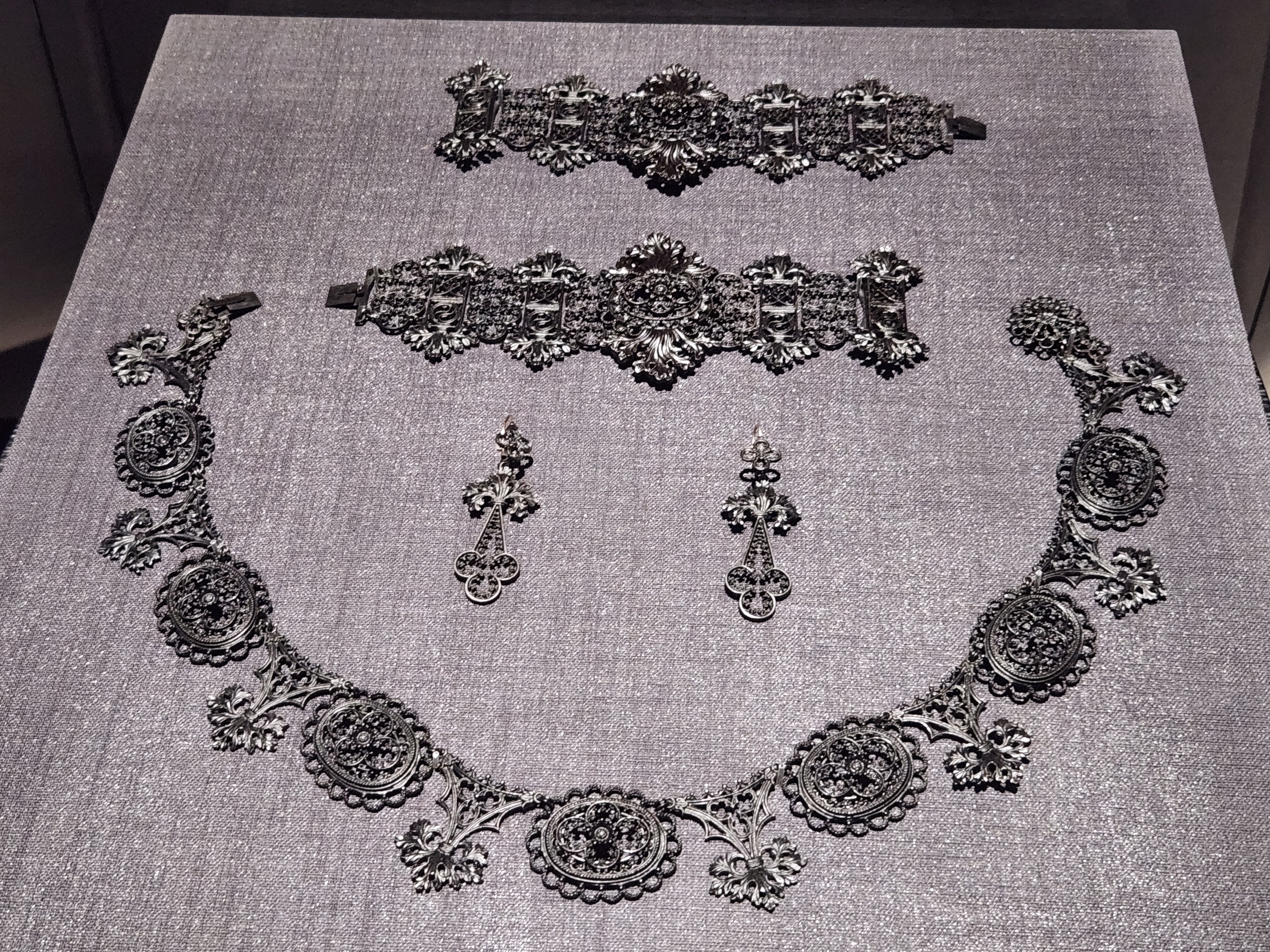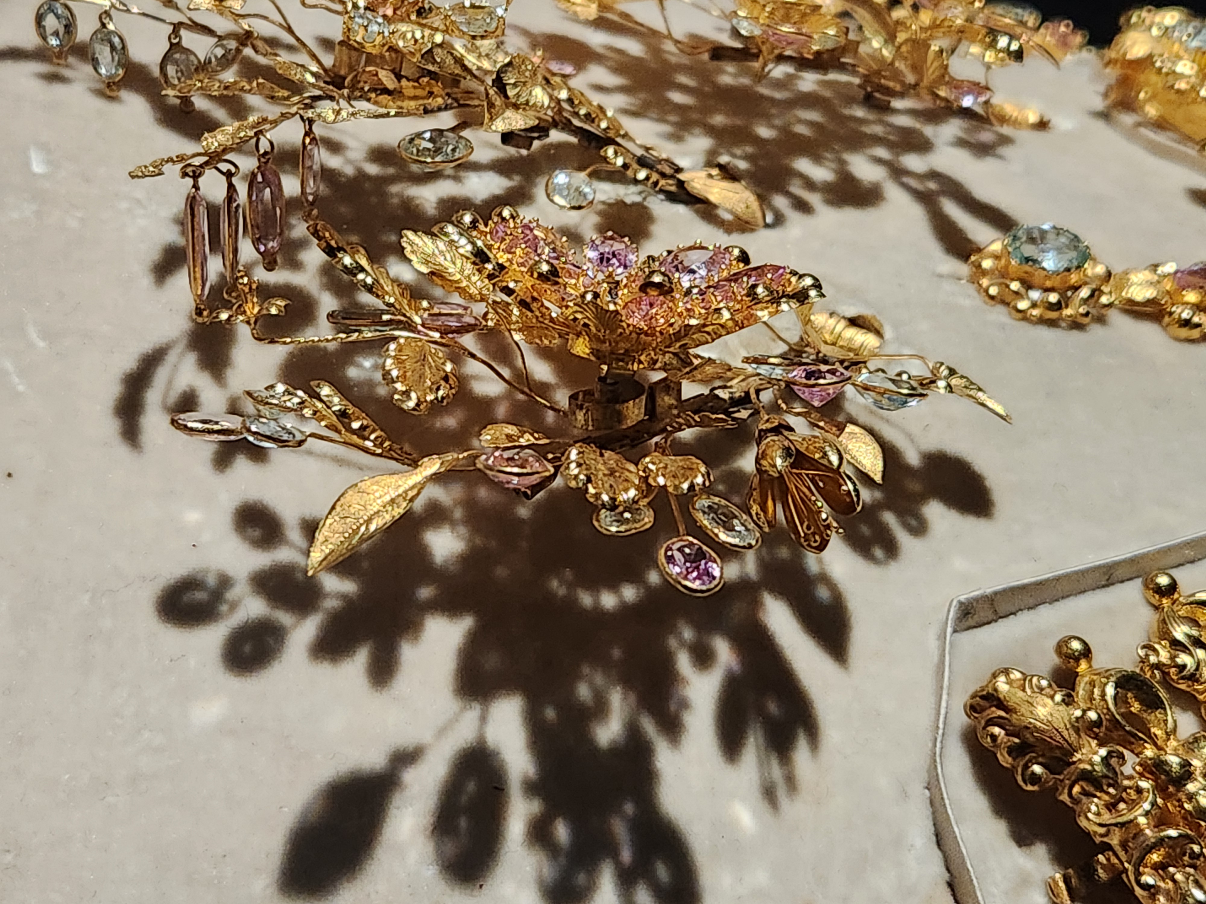 목걸이, 팔찌, 브로치, 귀걸이, 머리장식(?), 맨 위의 꽃 한 송이는 반지일까요.