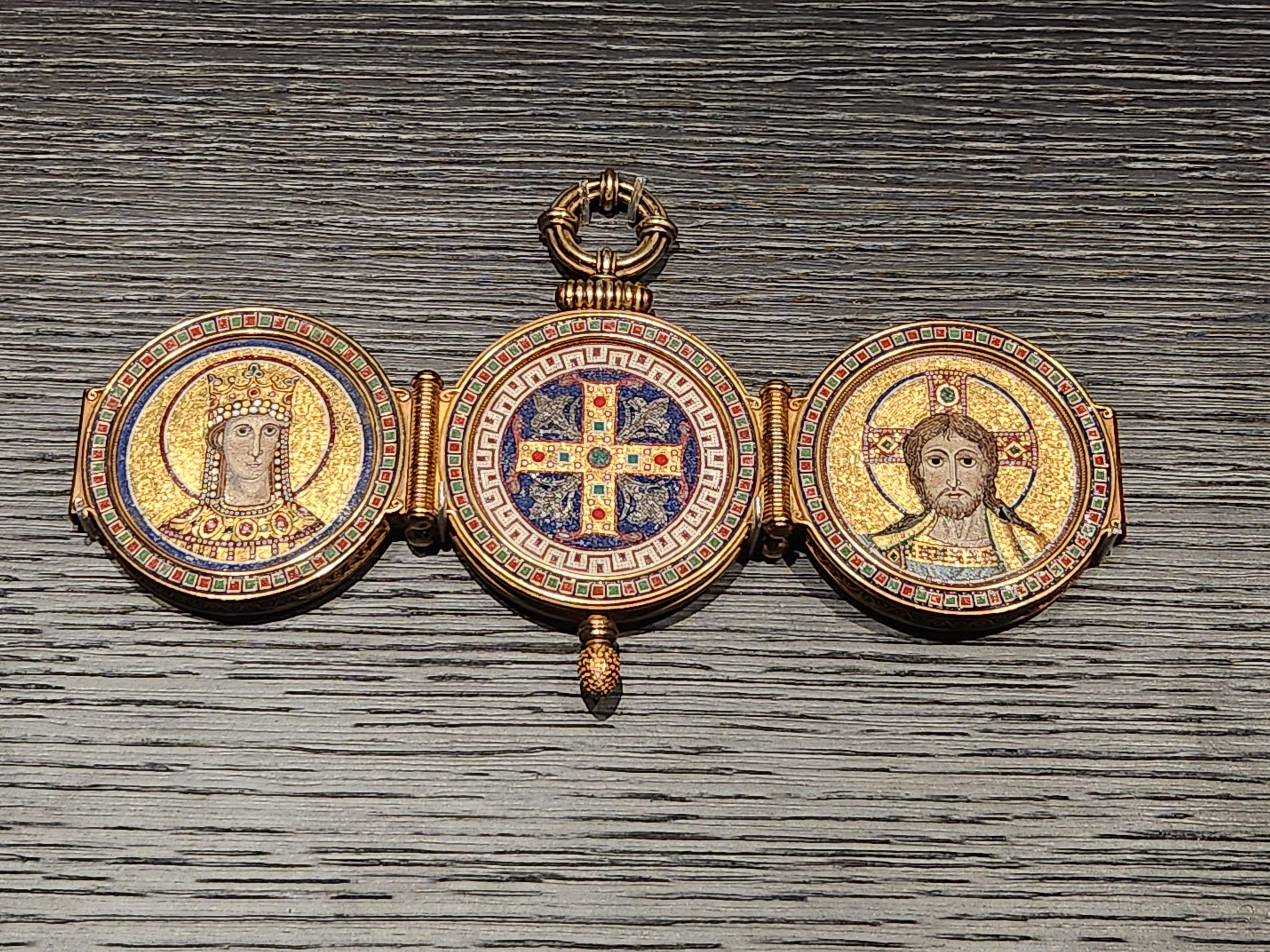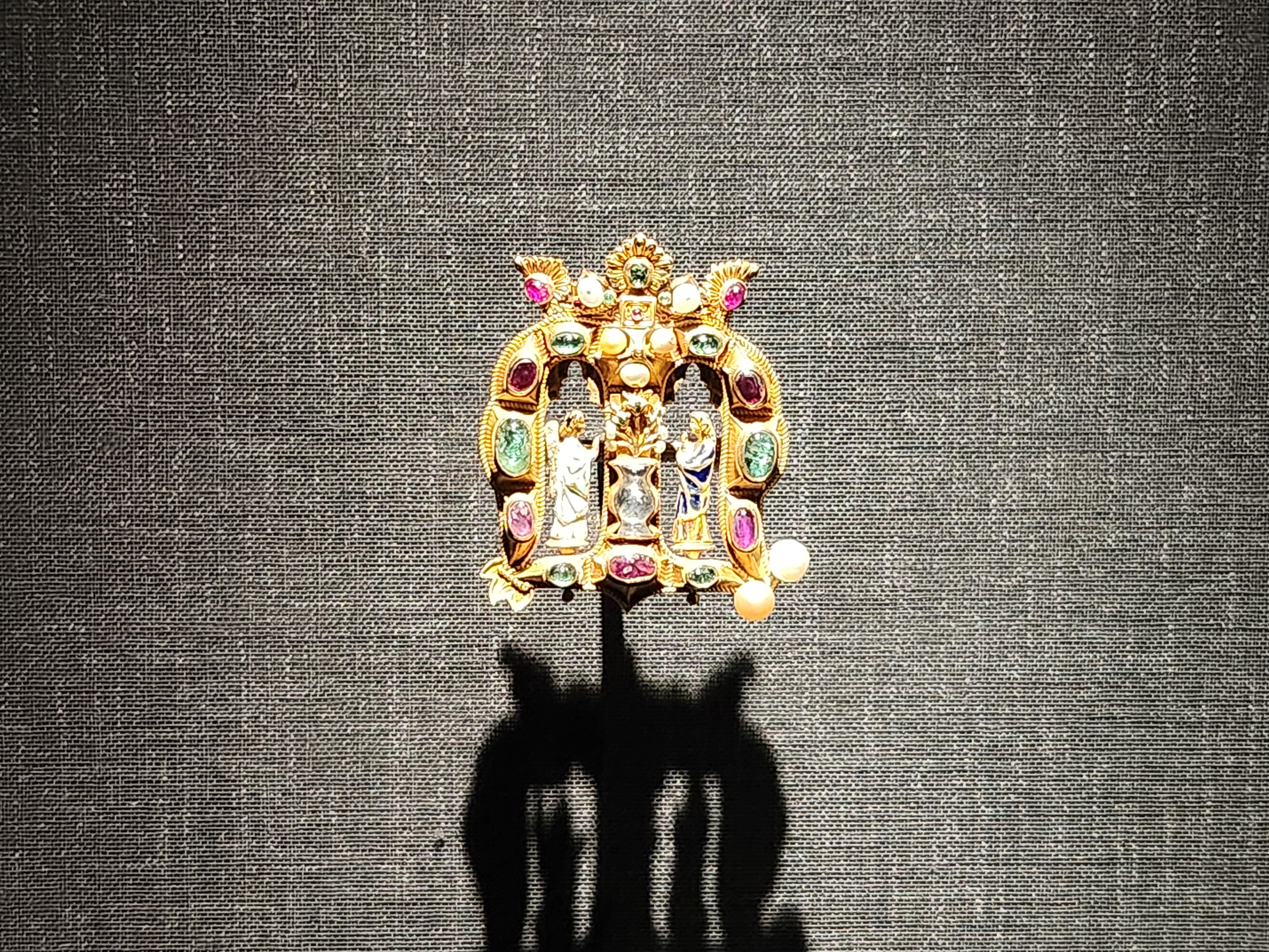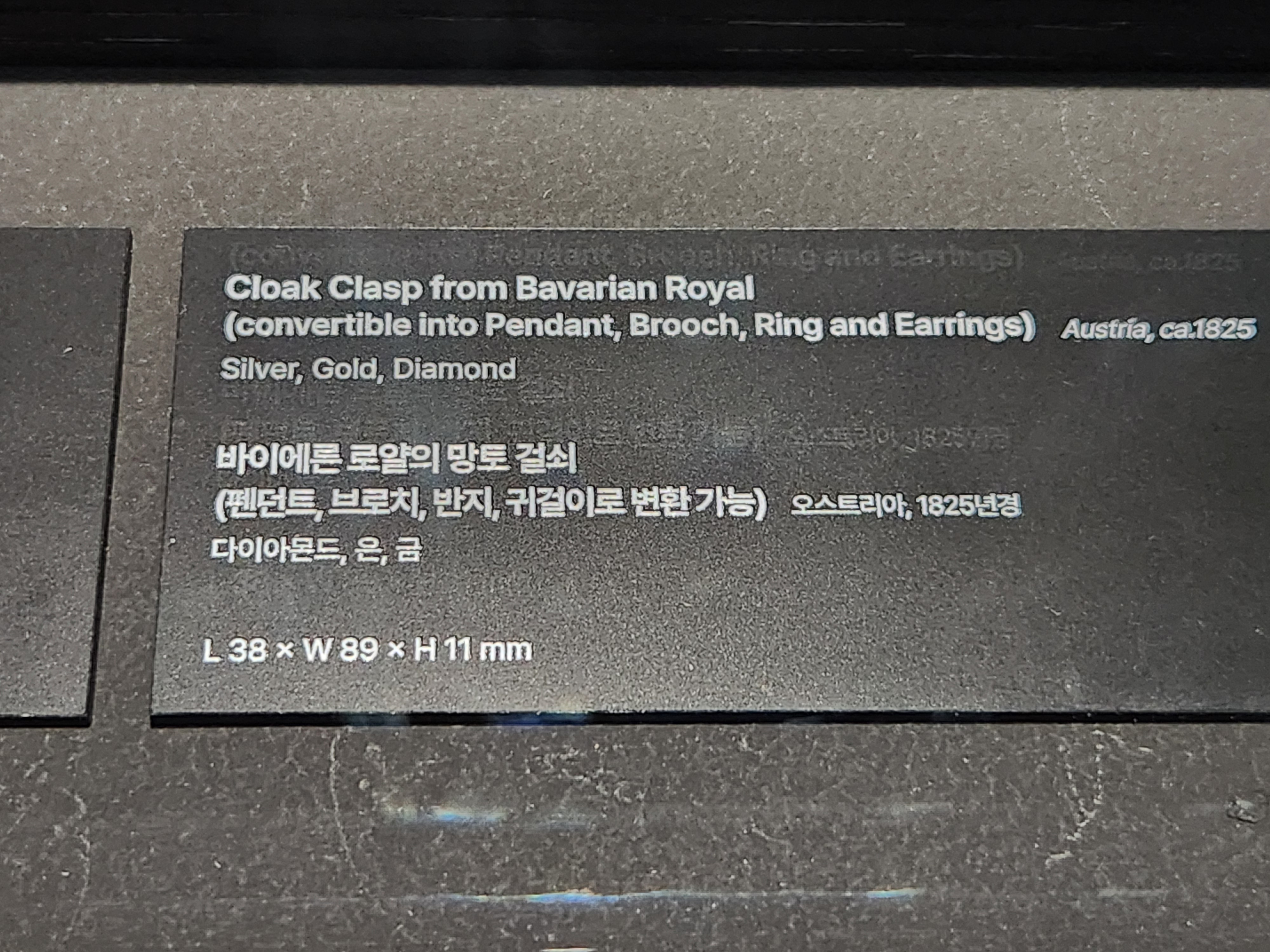 설명문에 따르면 망토 걸쇠인데, 분해하면 펜던트, 귀걸이, 브로치와 반지가 튀어나오는 물건이랍니다.