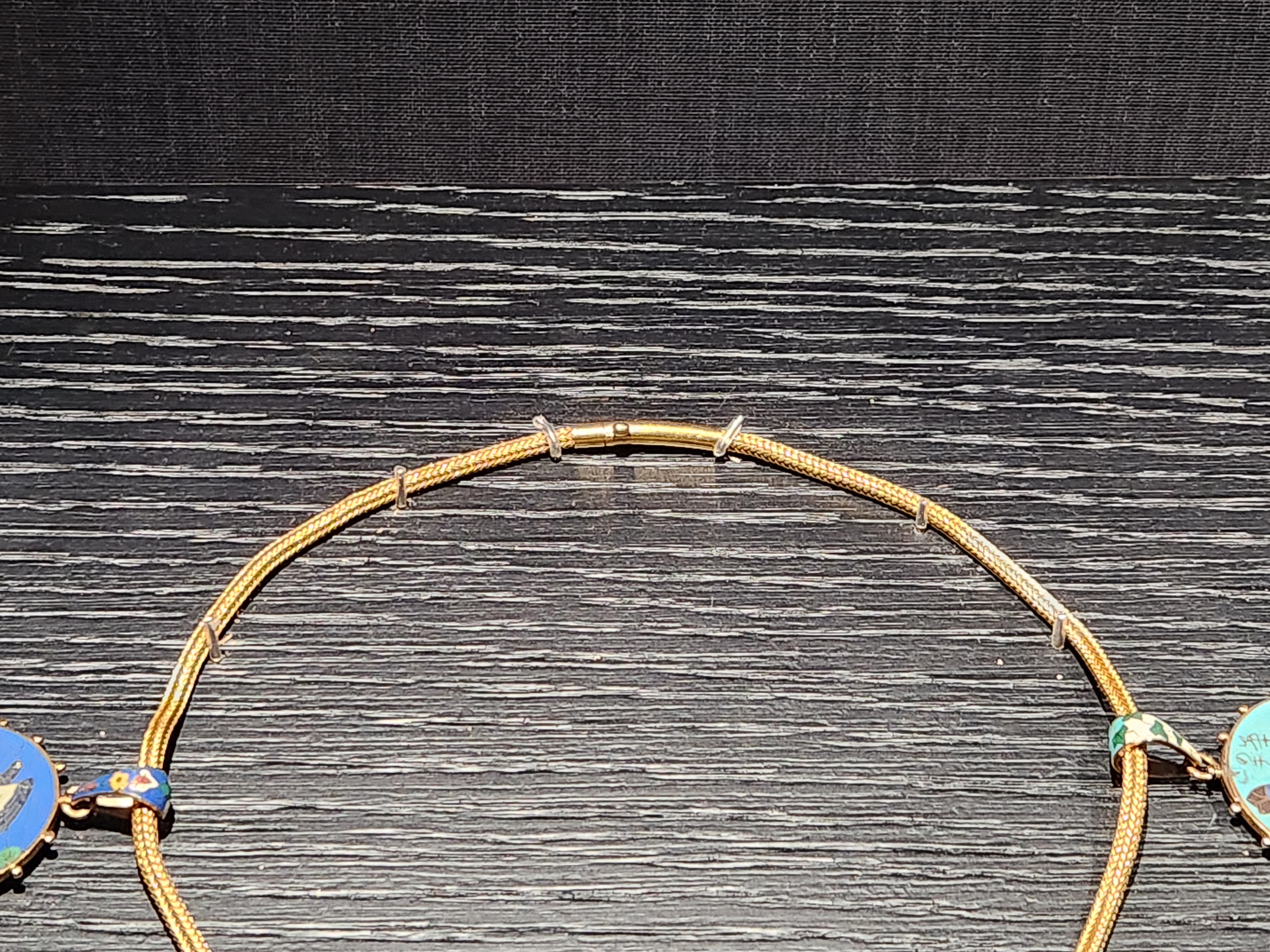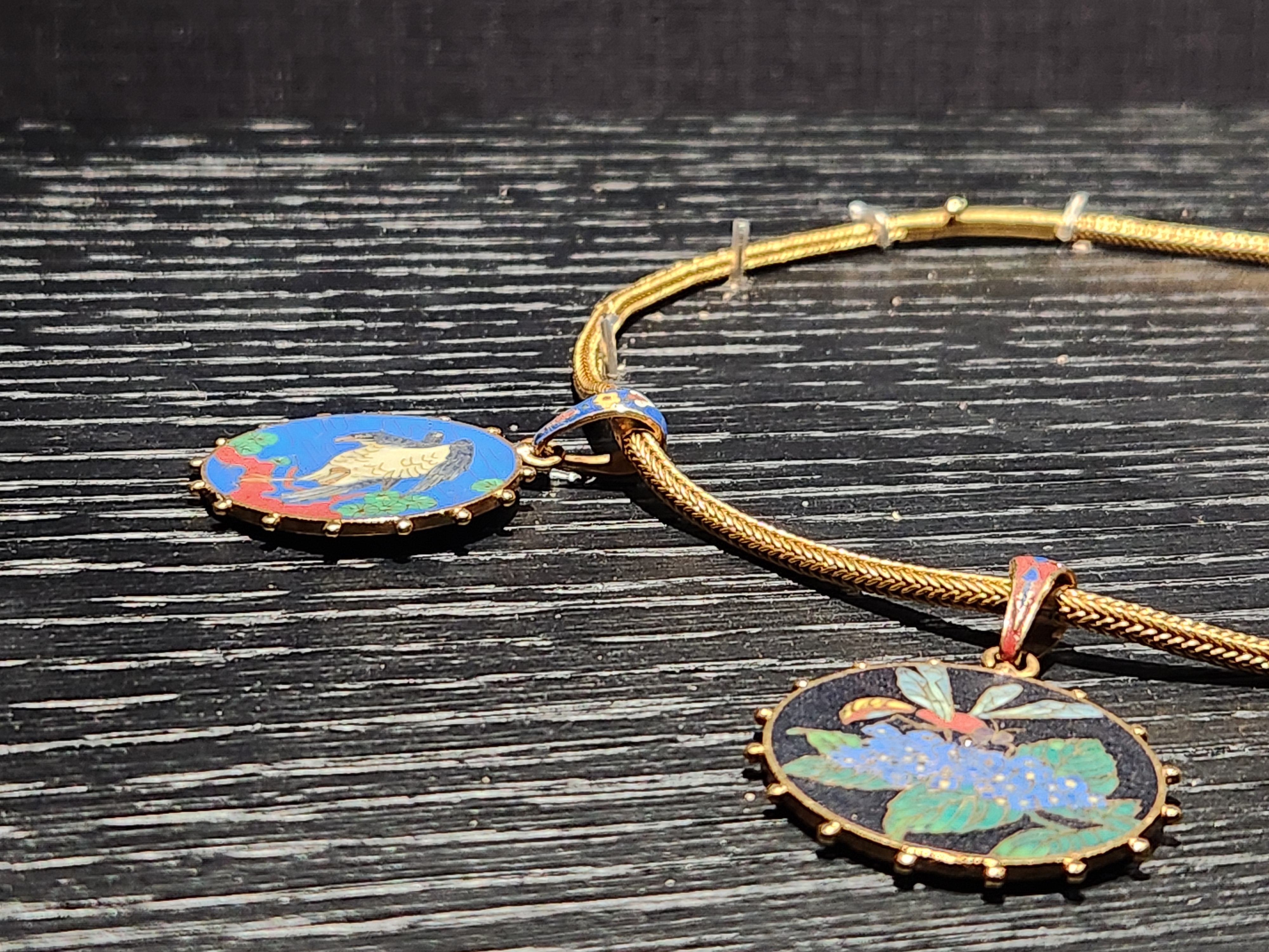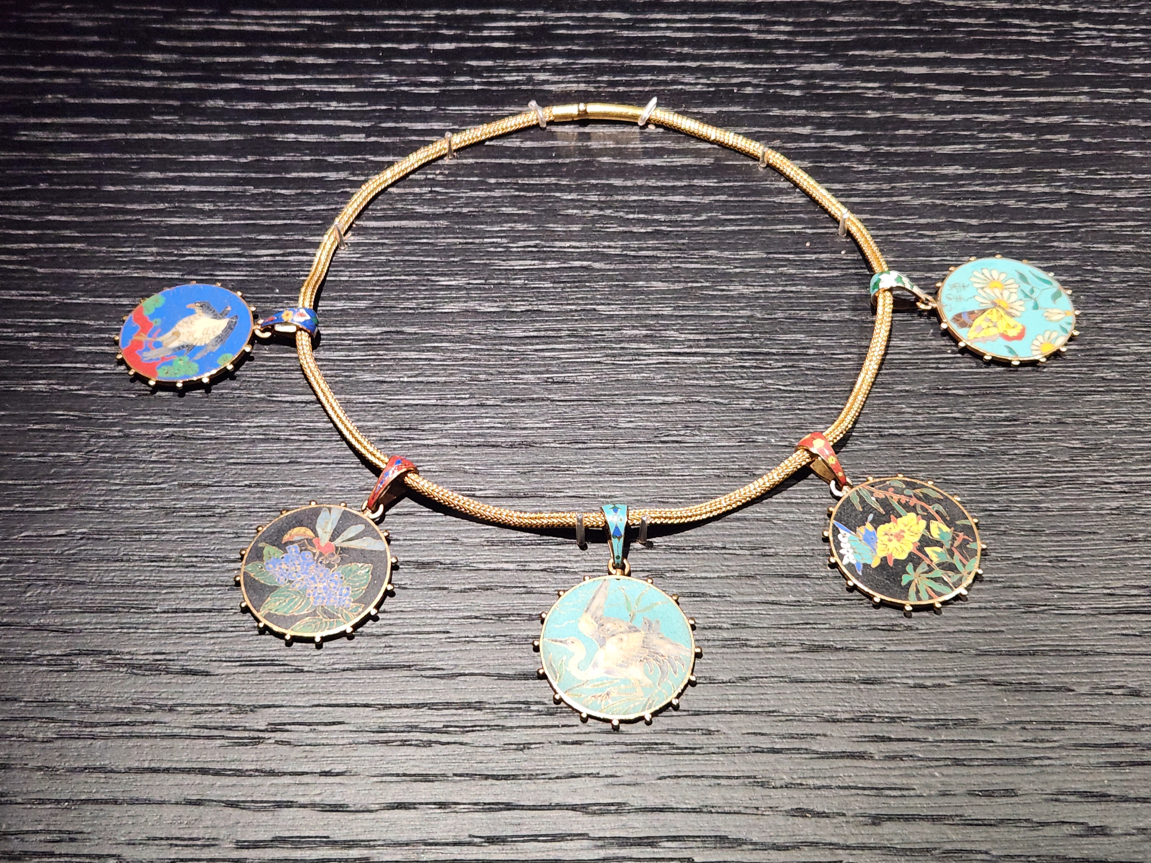 에나멜 그림 펜던트가 붙어 있는 목걸이.