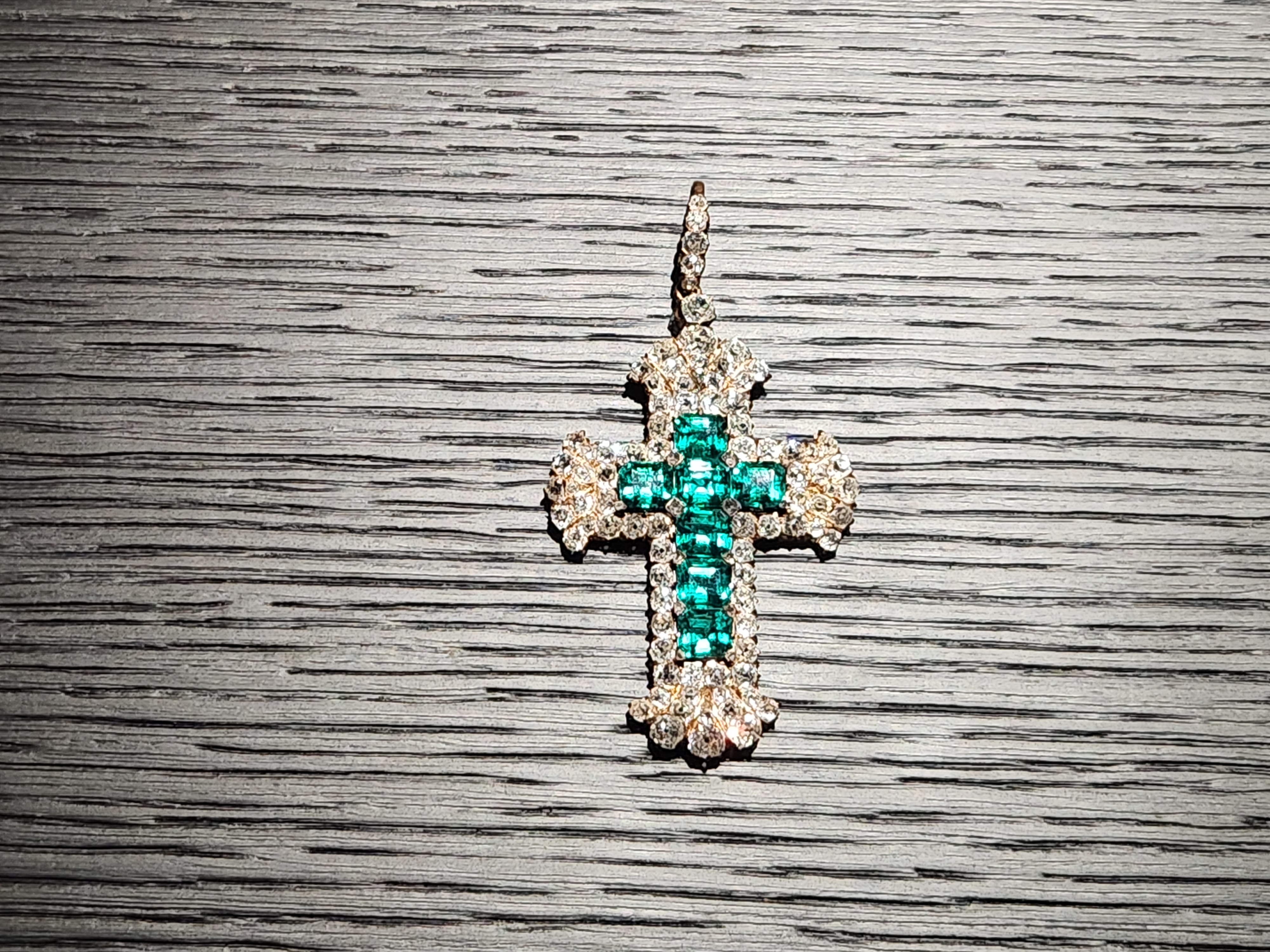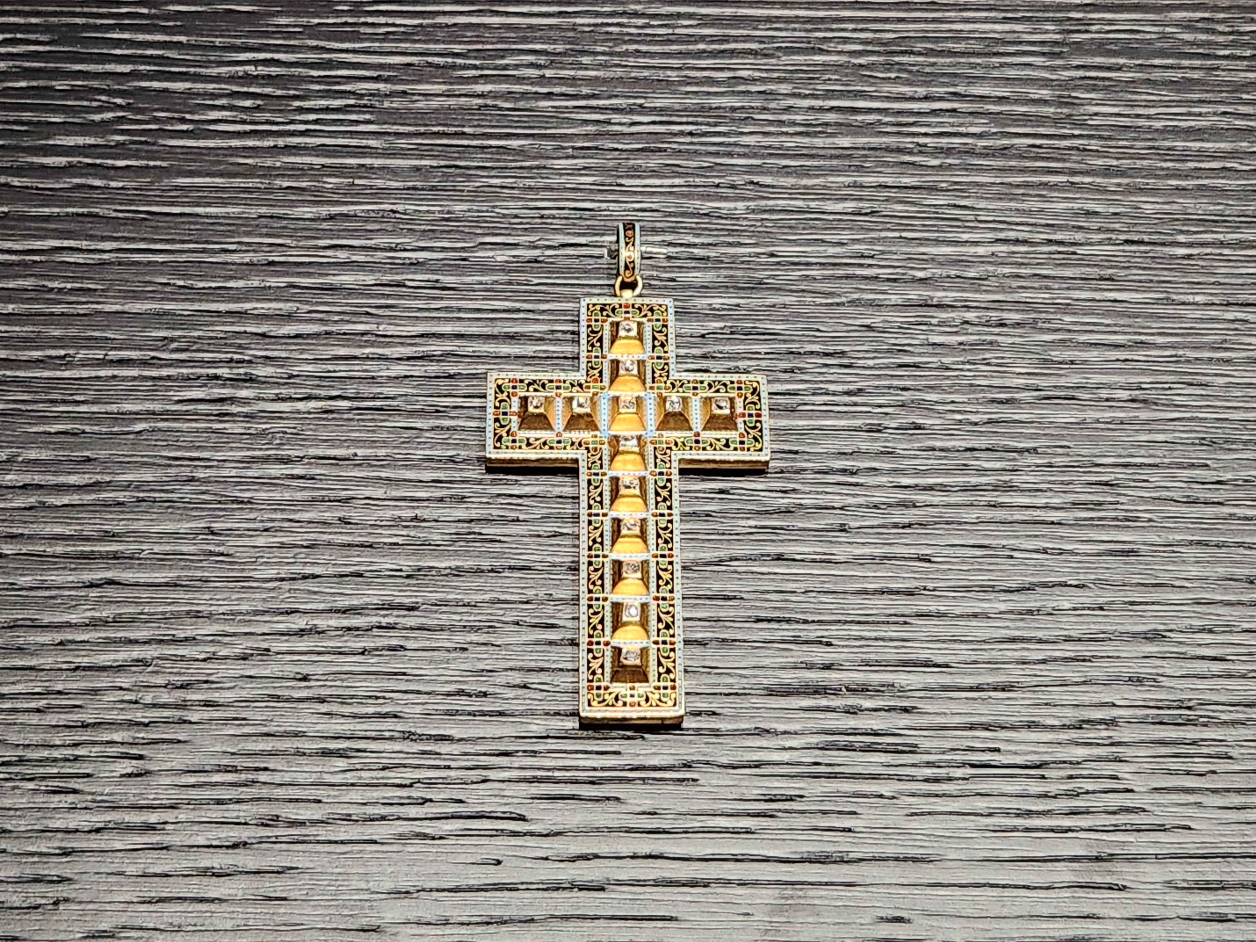 금으로 피라미드를 만들고 그 위에 다이아몬드를 세팅한, 정말 특이한 디자인의 십자가입니다.