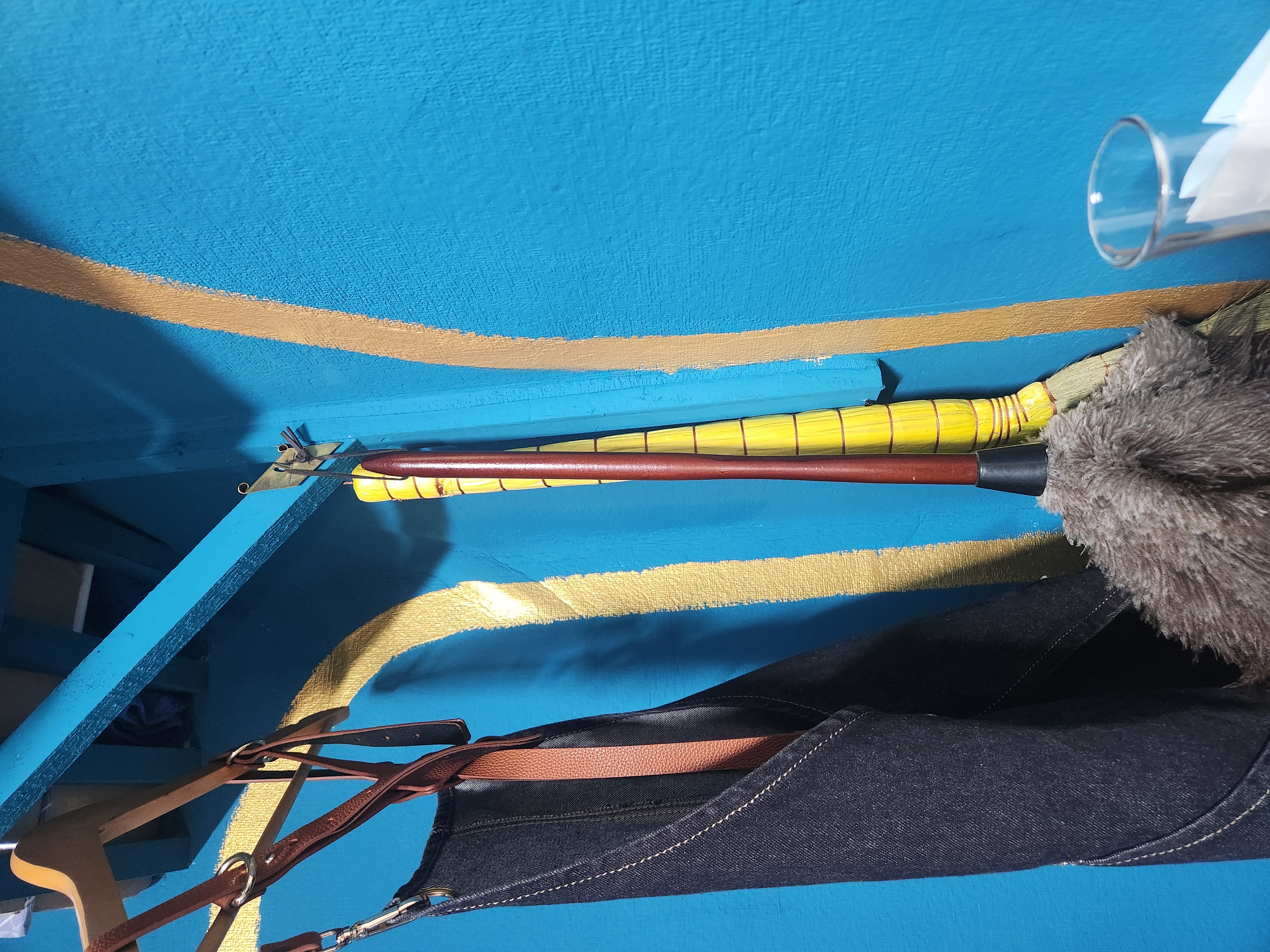 구부린 철사 옷걸이를 걸어놓은 자리에 먼지털이와 빗자루 등을 걸어놓고 싶었습니다.