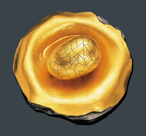 에일리언 같은 우주 생물의 알이 지구에 불시착했는데 금이 풍부한 원시부족이 발견해 신으로 모시며 장식해놓은 것 같습니다.