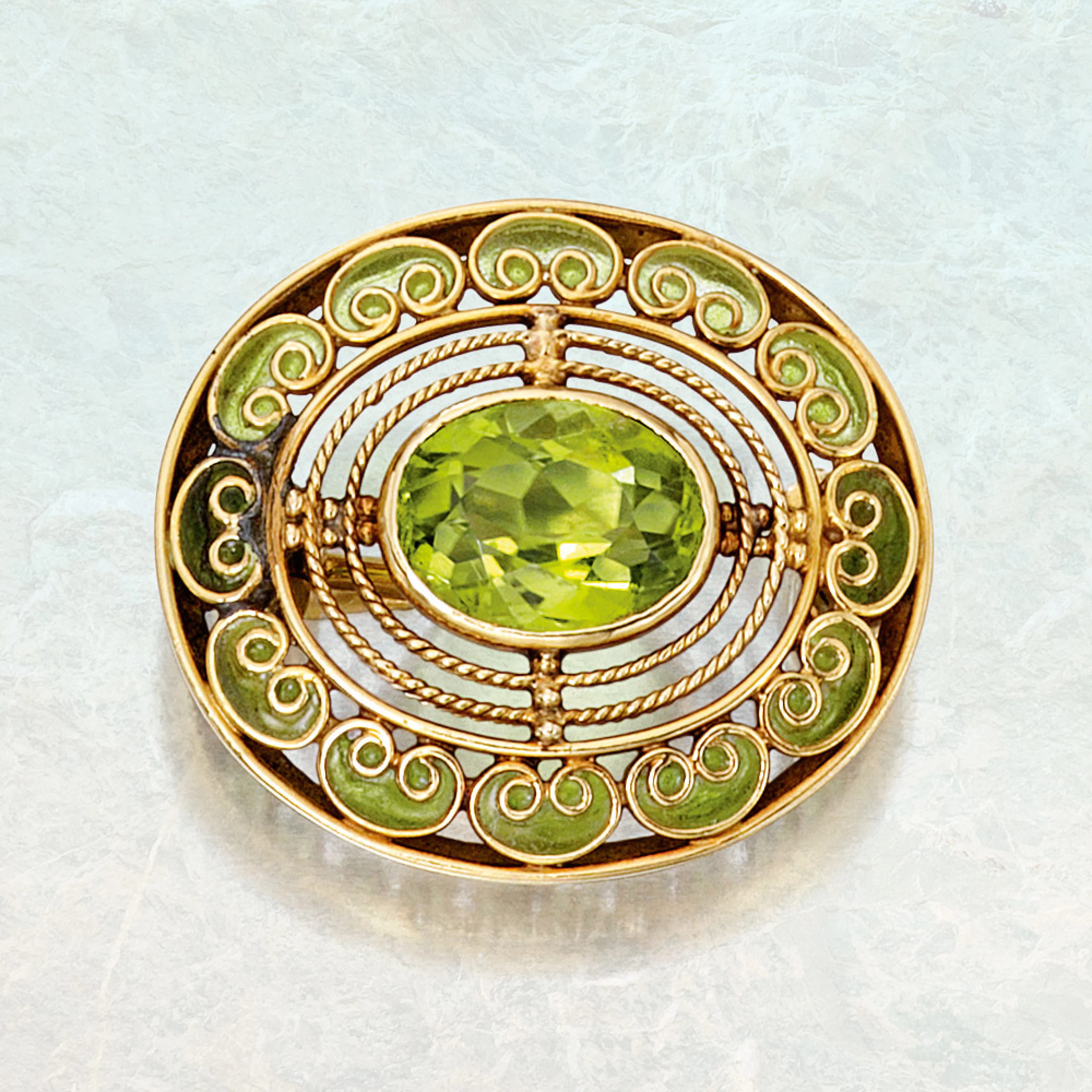 플리카주르 기법이 들어간 브로치네요. 가운데는 페리도트일까요?