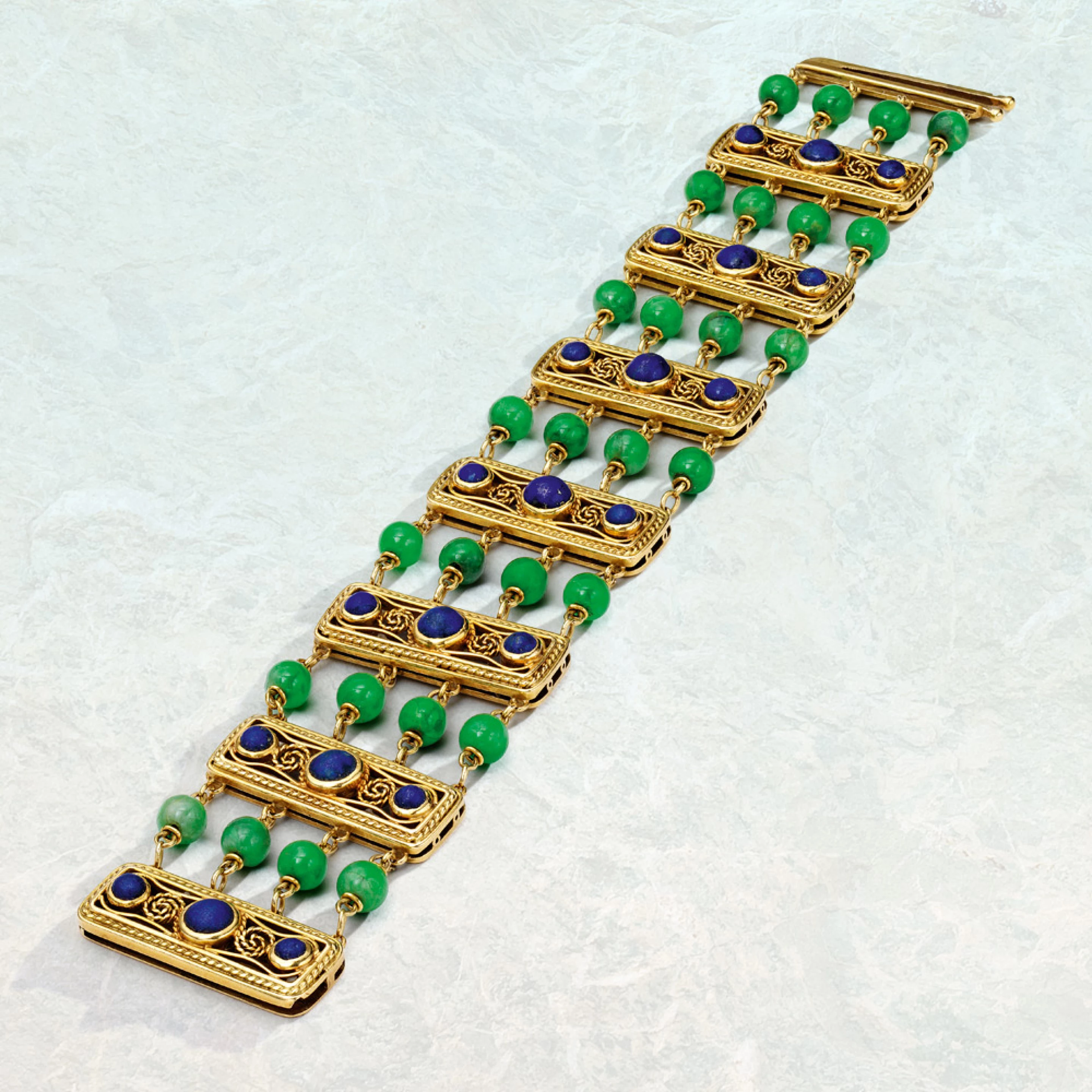 청금석(라피스 라줄리)와 에메랄드, 다이아몬드, 금인가요.