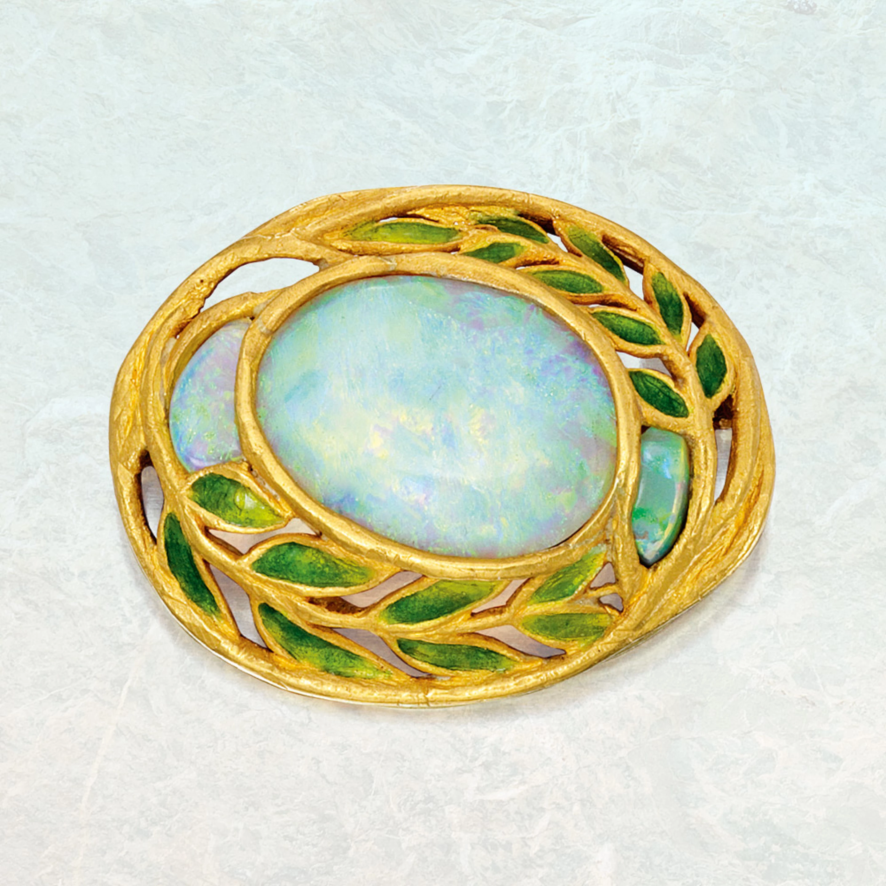 Inspired by the graphic disorder of nature — flowers and foliage, fruits and insects — and the varied American landscape, LCT became known for his organic designs. In his talented hands, garnets became berries with leaves of green enamel; opals in a gr