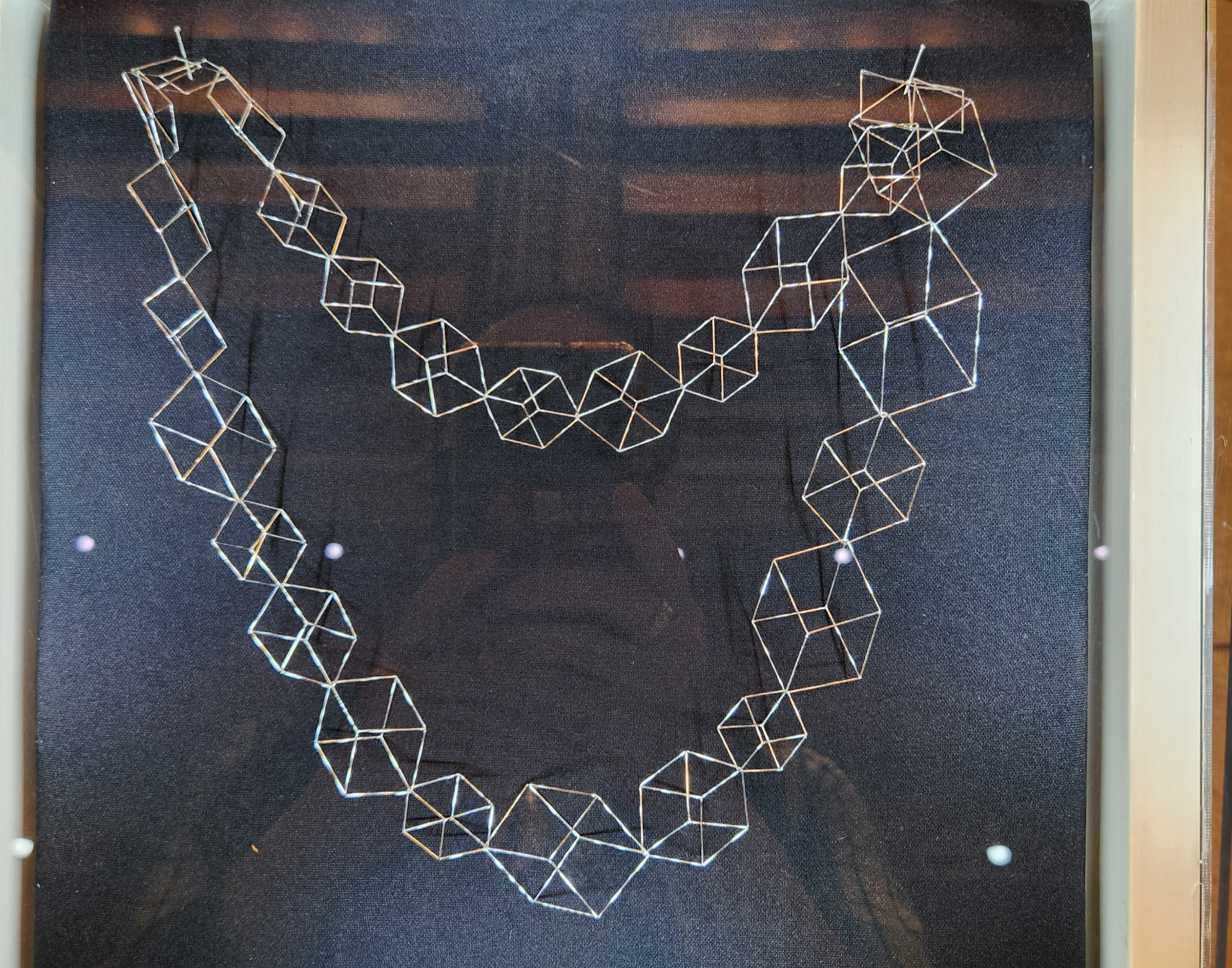 은선만으로 정육면체 입체처럼 보이는 구조물을 만들어서 서로 교차시켜 엮었습니다.