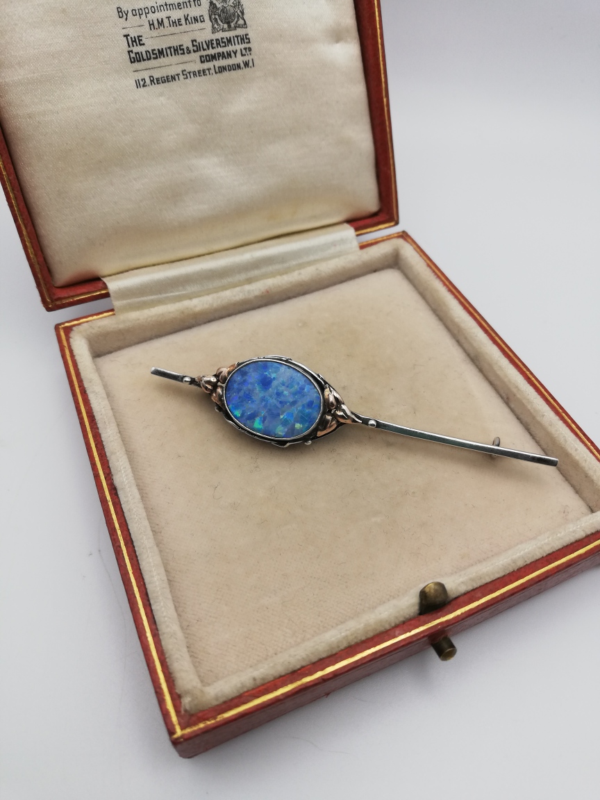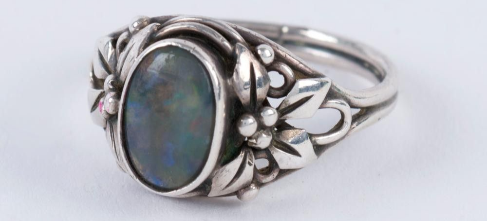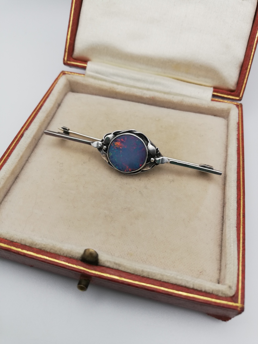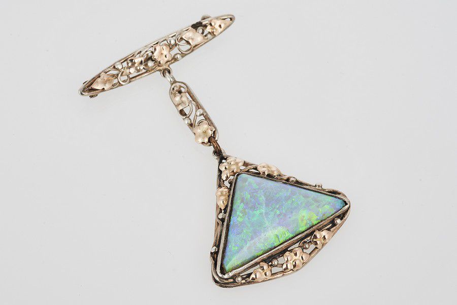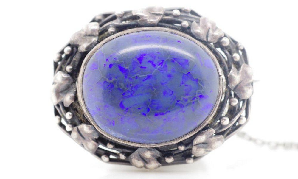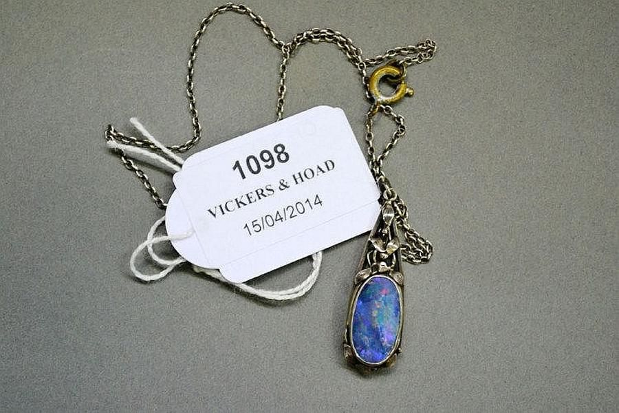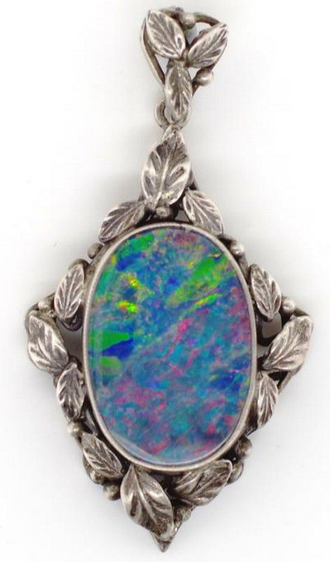 Opal pendant with silver surround in form of leaves and berries possibly by Rhoda Wager