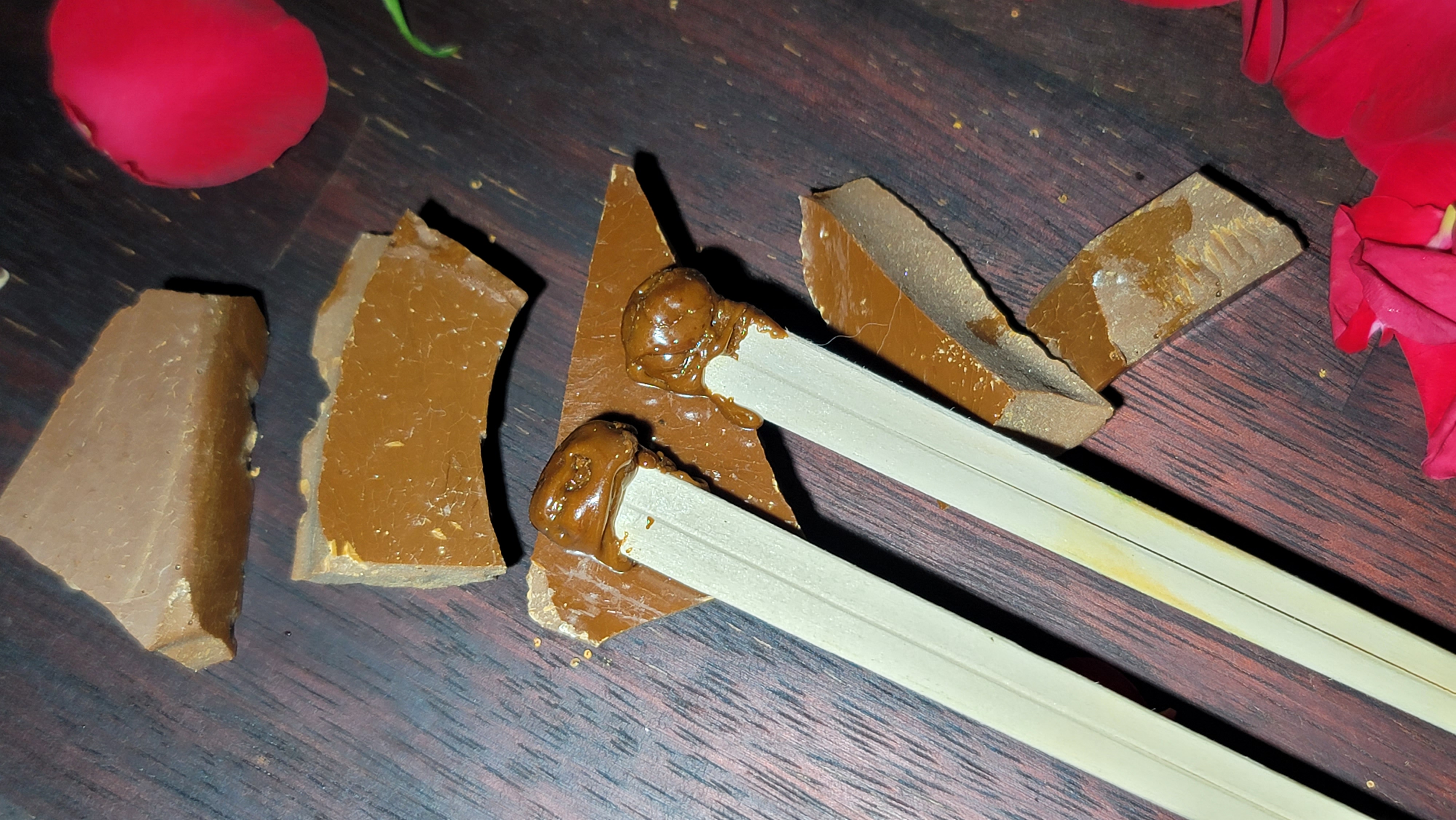 전문가들은 '돕스틱'이라 부르는, 황동으로 만들어진 전용 스틱에 이 세락 왁스를 녹여 붙이고
