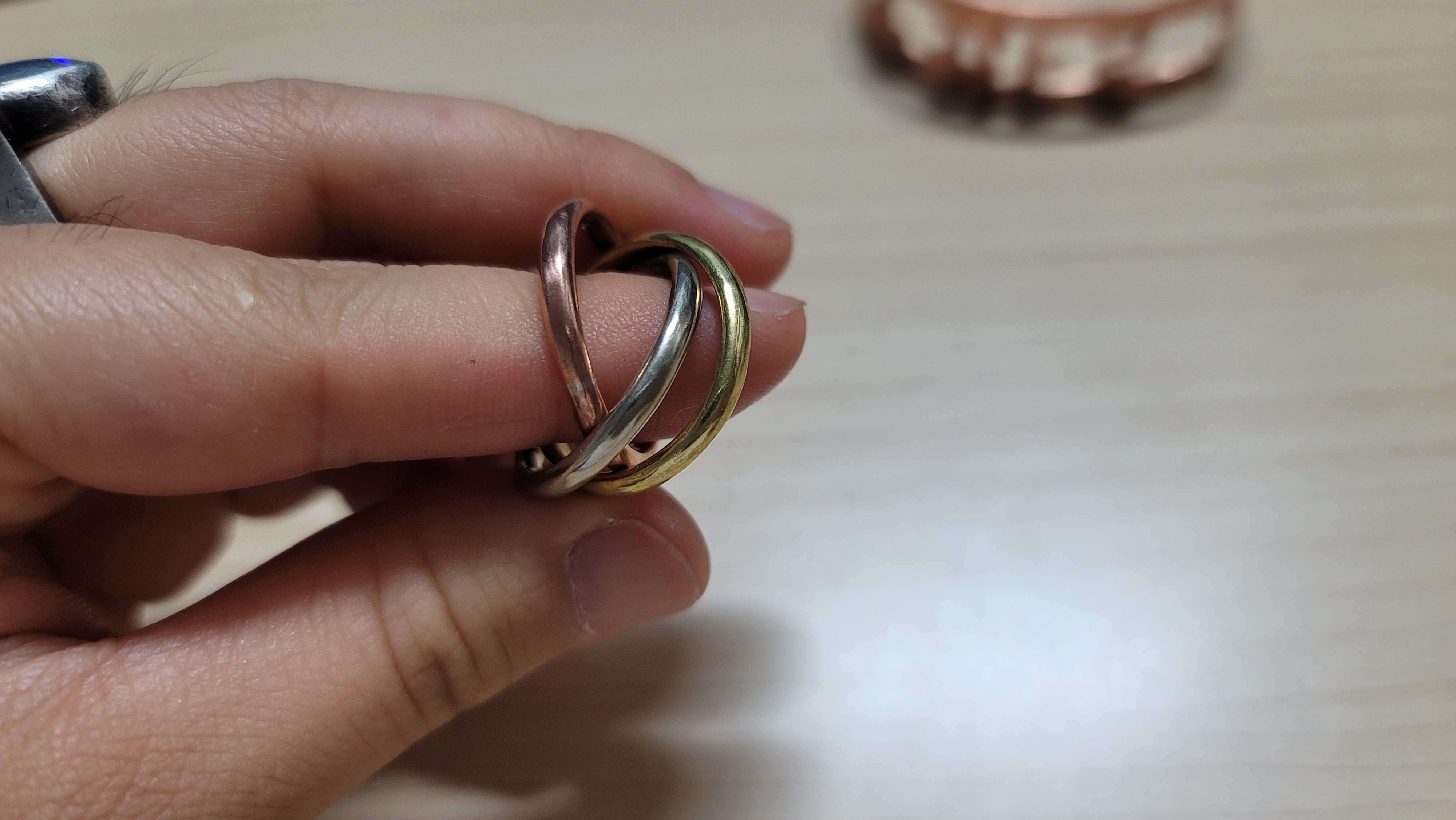 일반적인 귀금속 세공 공차 (허용 오차 한도)는 0.3mm 이라고 하는데, 트리니티링은 그보다 작은 0.2mm만 차이가 나도 반지 세 개가 자연스럽게 얽혀 돌아가지 않았습니다. 답은? 줄질이다...