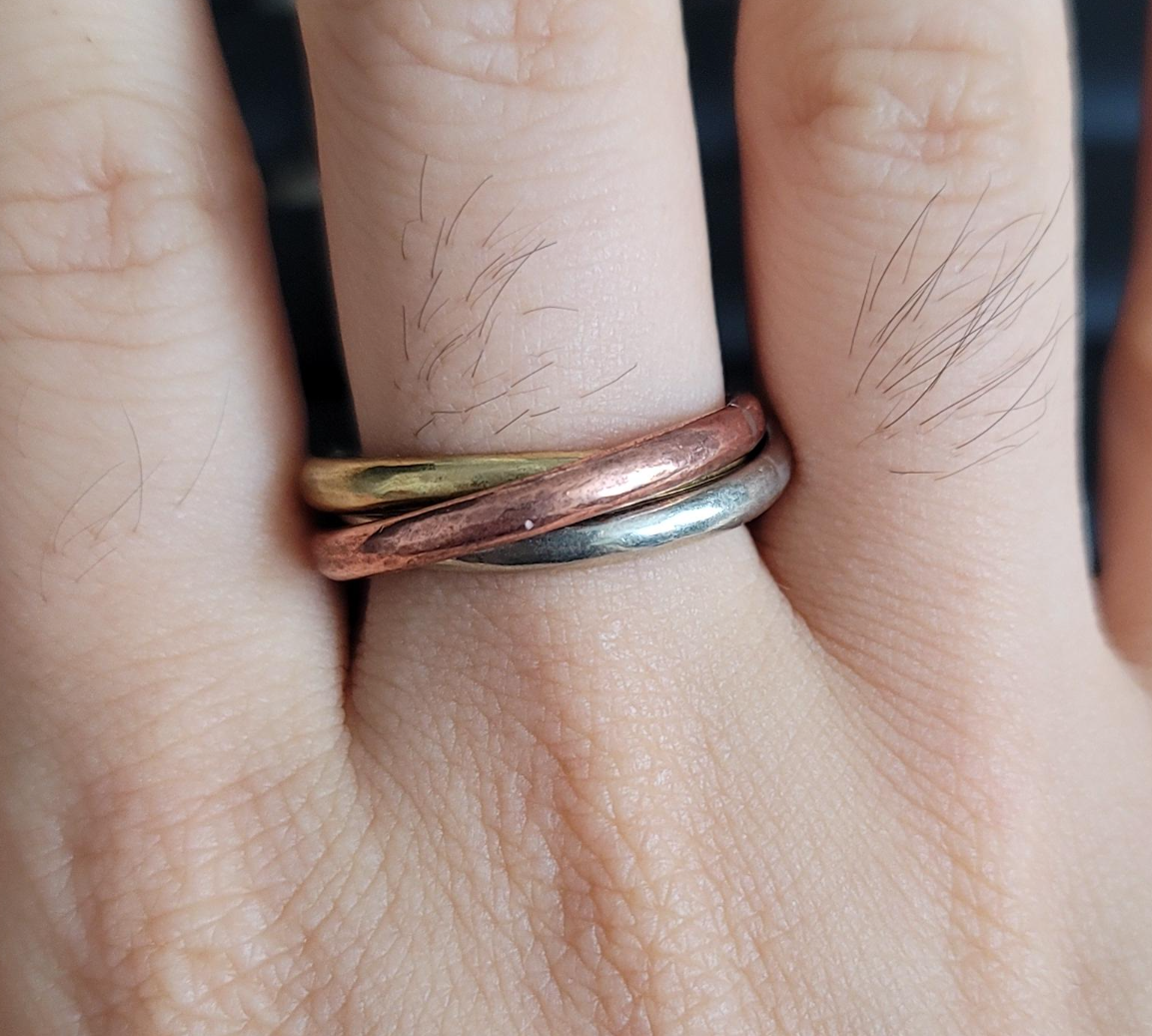 분명 시작한 일감은 동일한 치수로 만들기 시작했는데 반지를 만드는 과정에서 다 달라져버렸습니다. 적동이 제일 잘 늘어나고 황동, 백동 순입니다. 백동을 늘리기 위해서 몇 번이고 뜨임질하고 두들기기를 반복...